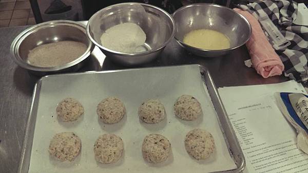 主廚要我裹完麵包粉之後,再裹一次蛋汁跟麵包粉。多一次這個步驟感覺飯糰的外層更扎實。飯糰裹好之好放在冰箱半小時。